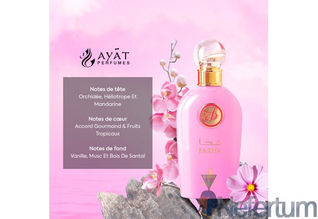 Farha yra kerintis ir džiaugsmingas aromatas, skirtas ieškantiems egzotiškų ir gurmaniškų kvapų. Šis harmoningas aromatas sujungia gėlių, vaisių ir medienos natas, kad sukurtų žavią kompoziciją, primenančią tropikų šilumą ir turtingumą.